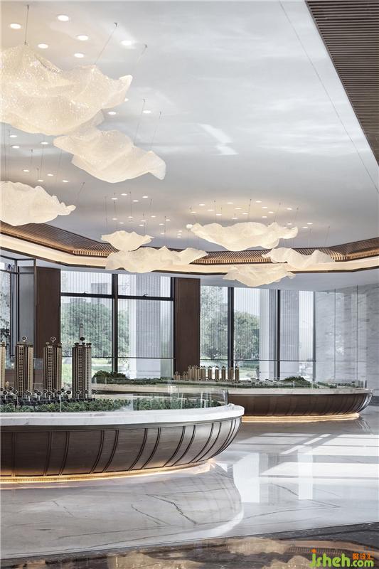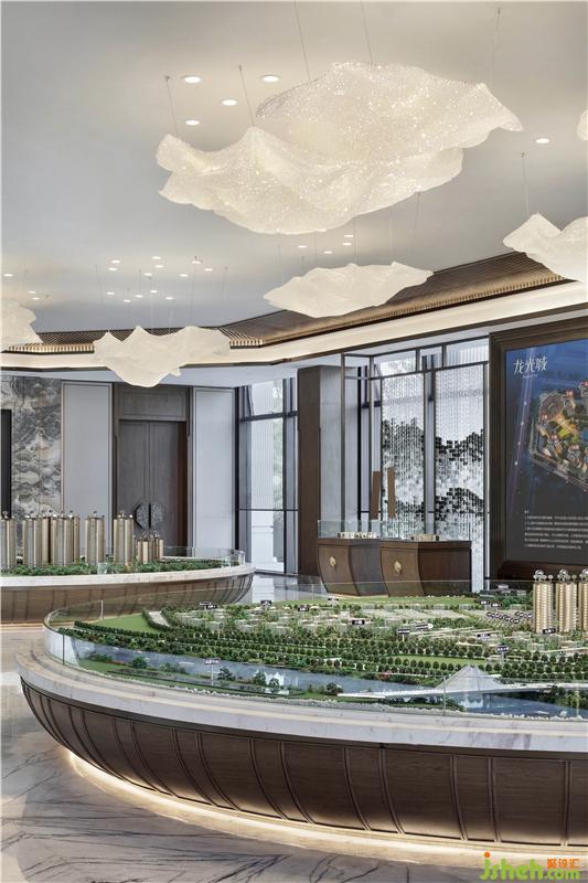 模型圖后另設(shè)山水紋水晶玻璃屏風(fēng),繁縟而有節(jié),化為映像的細(xì)聲,既是美的展示,又適宜空間的分割,影影綽綽之間感受“清風(fēng)徐來(lái),水波不興”之境。裝修設(shè)計(jì)