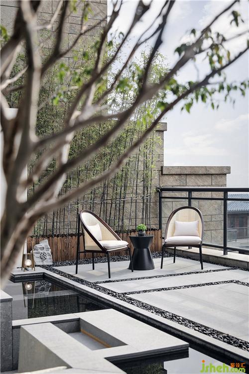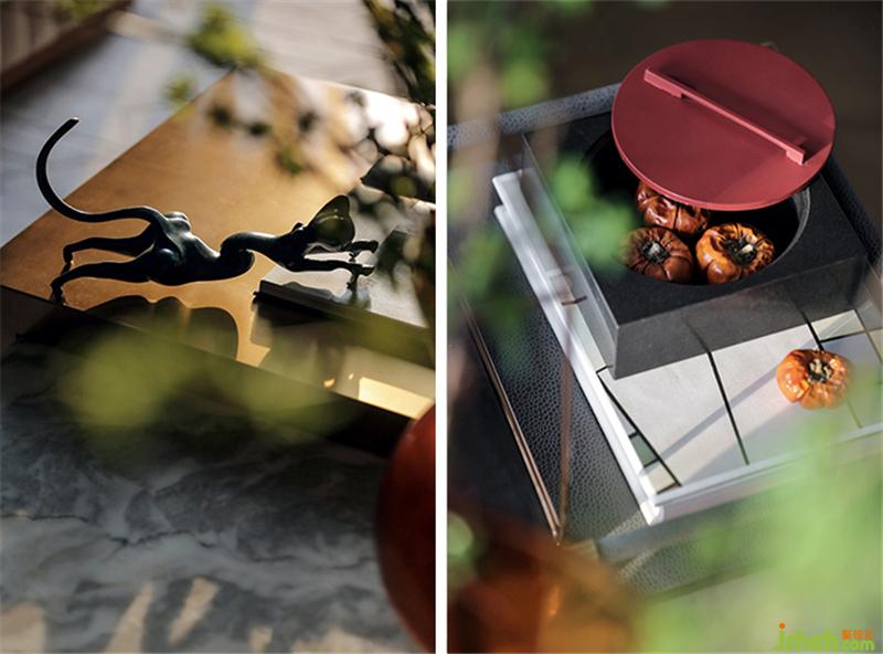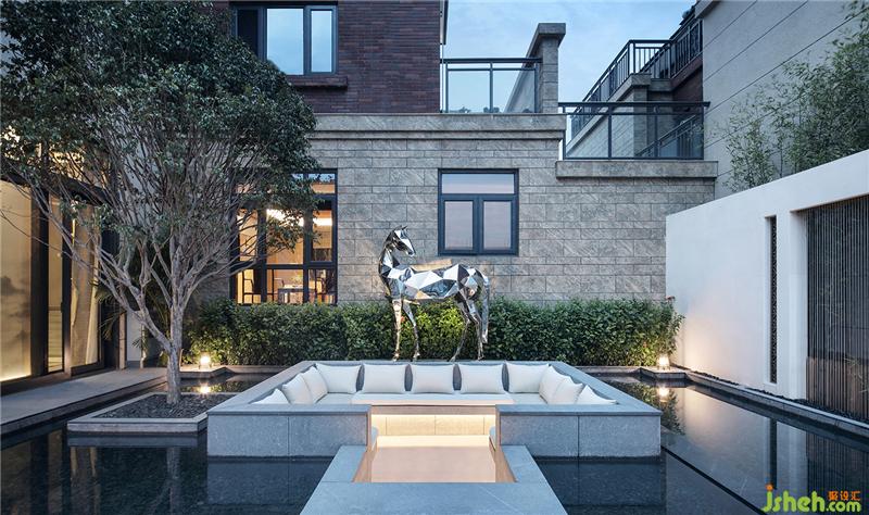 一層客廳與庭院相連,視野開闊。庭院內(nèi)設有下沉式水景休息區(qū)以及水幕簾景觀墻,庭院水池間設有下沉休息區(qū),讓人們在休息時更加親近大自然,給人不一樣的視角和體驗?!霸倩厥住苯饘偎囆g(shù)馬是樣板房設計師專門為庭院空間打造的藝術(shù)雕塑,多棱鏡面的反射讓物象自然相映,青山綠水,雍容自在。