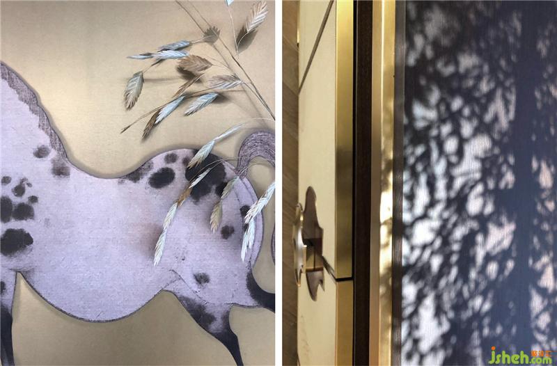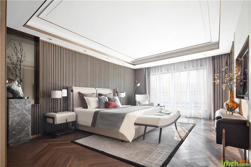 二層次主臥設計主題為“獨夢桃芳”,床后的格柵屏風增加了自然的氣息,放在床頭的藝術(shù)品《尋夢-獨夢桃芳》更是活躍了整個空間、整體簡約而有韻味。