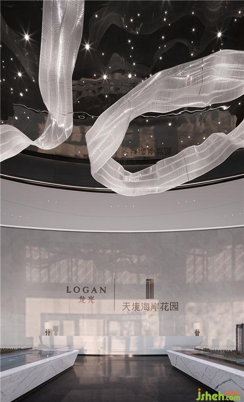 挑空大堂將宇宙的斗轉(zhuǎn)星移幻化于空間之中,有如夜空之中璀璨的星光,飄逸舞動的藝術(shù)燈飾裝置蜿蜒流轉(zhuǎn),如同九天銀河匯入星海,伴隨人影流動,頗有踏月神行、遨游星海的輕盈感。空間中摒除多余裝飾,光影在有限的空間尺度投射出無限的闊度,于方寸之間,獲得震撼心靈的觀感體驗。