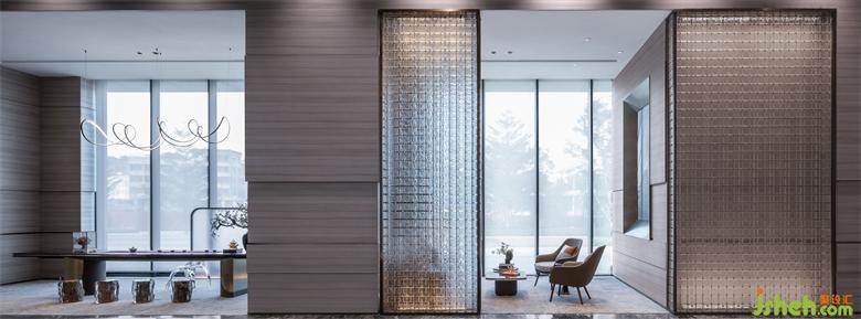 洽談區(qū)以四面圍合的形態(tài)環(huán)繞沙盤(pán)空間,深圳營(yíng)銷(xiāo)中心設(shè)計(jì)以玻璃磚墻打造空間的界限與連接,營(yíng)造澄澈通透的情境體驗(yàn)。結(jié)合室外的景觀、碧藍(lán)天空,植入洽談功能,在繁華的都市中感受“長(zhǎng)煙一空”、“漁歌互答”的寧?kù)o悠然。