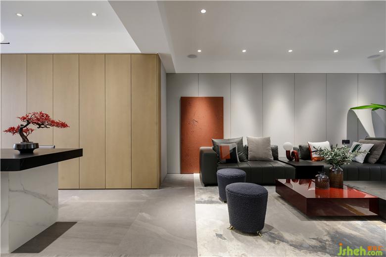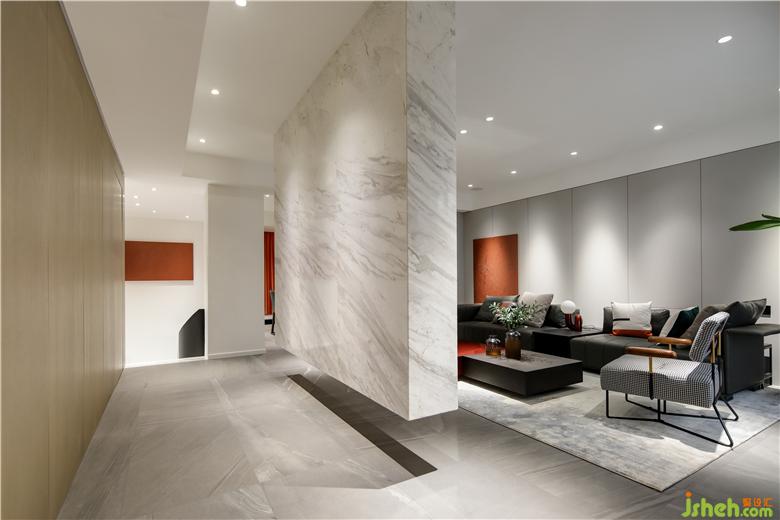 電視背景墻的爵士白大理石提供整面的寧靜,視線落點(diǎn)上大面積的留白,構(gòu)建內(nèi)全新的平衡感,沈穩(wěn)冷峻的黑色在其中交織,家具器物在材質(zhì)、肌理、色澤上的藝術(shù)效果結(jié)合光影意境,調(diào)動居者對於美好生活豐富而立體的感知。