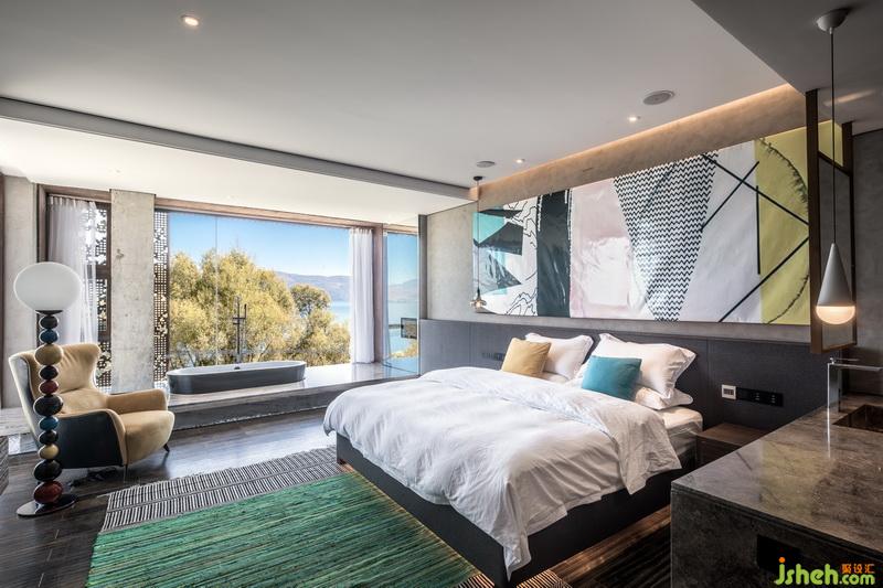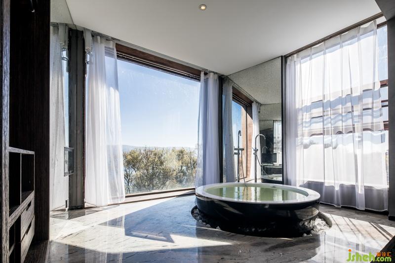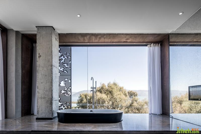 客房的設計也遵循這個原則。整面的落地玻璃窗,裸露的水泥墻面,白色的天花,把窗外的風景放大。窗邊做了觀景臺,浴缸鑲嵌在地面中。泡澡看星空時,沉浸在山海的懷里。