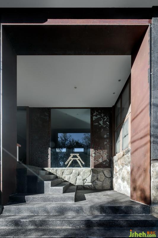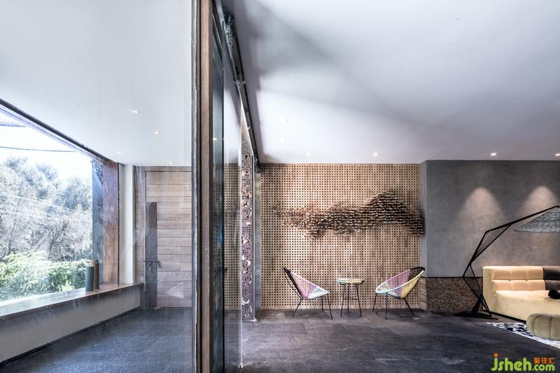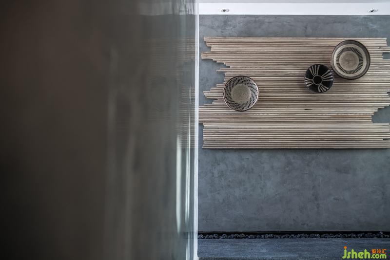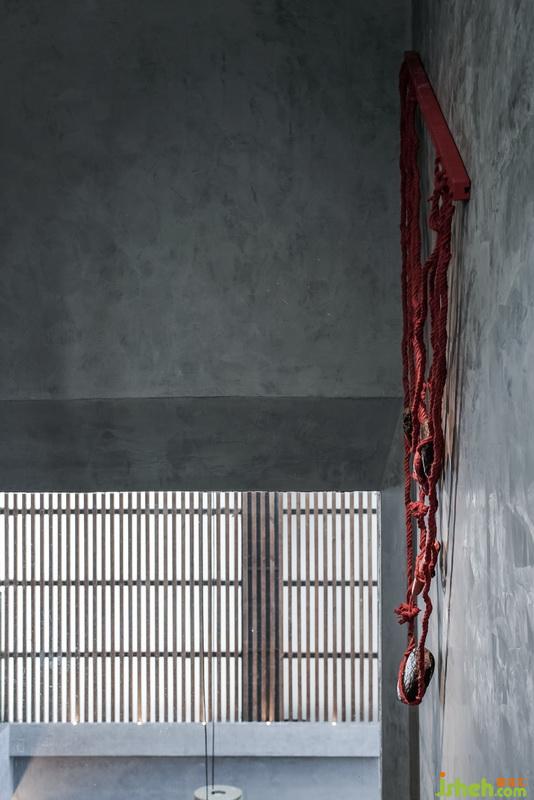 尹盛濤父親是木匠,他曾當(dāng)過幾年的木工學(xué)徒,對木頭有著深厚的感情。客棧用了大量的木格柵裝飾墻面,可變換不同的造型。溫潤的木頭和裸水泥墻面、青石板地面碰撞,彰顯材質(zhì)本身的美感。