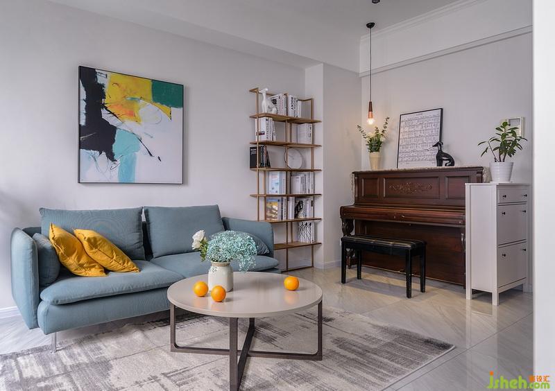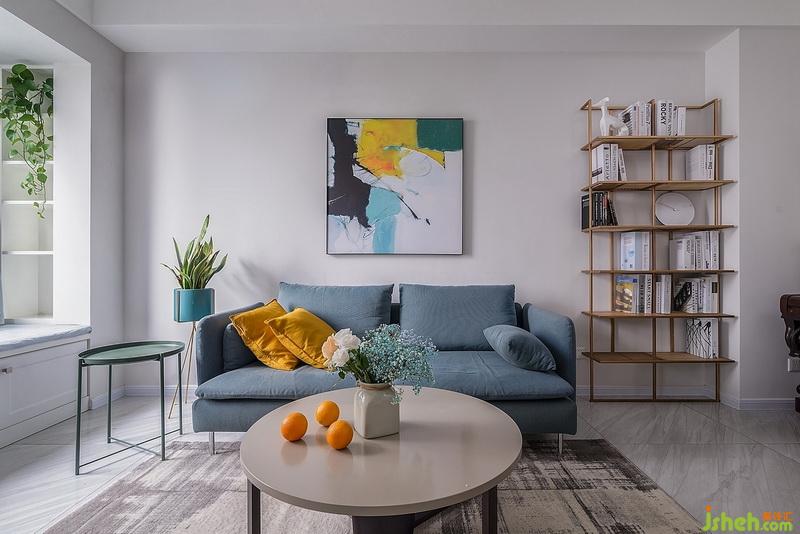 簡潔為主,素雅的色彩搭配,掛畫上的一抹黃點(diǎn)亮空間。藍(lán)色沙發(fā)上用兩只亮黃色抱枕呼應(yīng)。