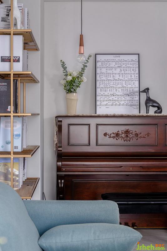 女兒正在學(xué)彈鋼琴,根據(jù)原始房屋結(jié)構(gòu)特點(diǎn),將客廳一個角落打造成意境十足的鋼琴角。旁邊的一排書架,還可容納不少書籍。