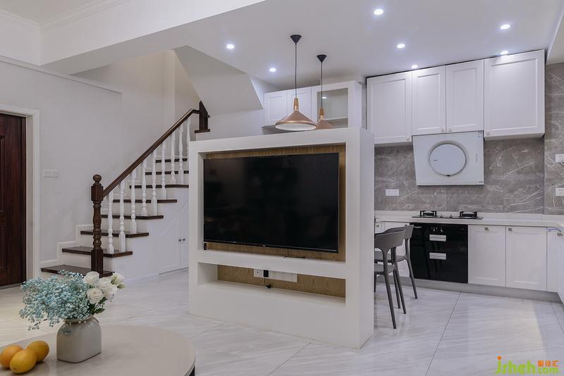 隔斷式電視背景墻,解決電視懸掛問題,解決客餐廳劃分,餐桌有墻可靠增加安全感。