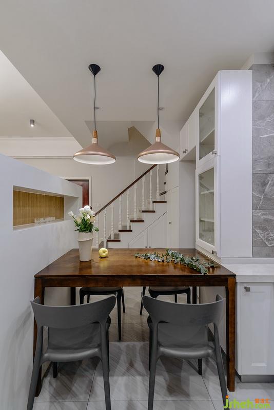 樓梯下方空間室內(nèi)設(shè)計(jì)師設(shè)計(jì)了一整排儲物柜子,增加收納;櫥柜也一起連過來靠墻做了通透玻璃高柜,方便后期放置杯子紅酒之類物品。