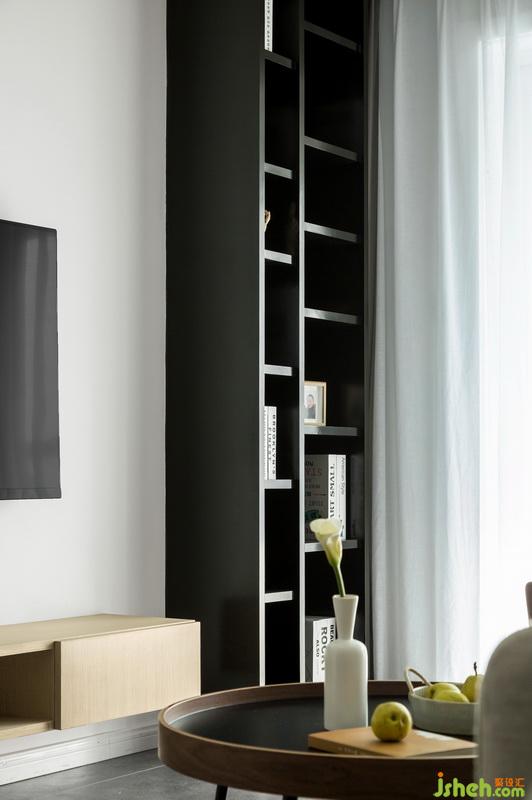 電視柜和裝飾柜為壹石現(xiàn)場(chǎng)制作,除增加收納功能以外,黑色裝飾柜也給簡(jiǎn)潔的空間多了一份硬朗。在設(shè)計(jì)上的色調(diào)搭配,過多的深色會(huì)讓人產(chǎn)生壓抑,而如果沒有深色相稱也就反襯不出質(zhì)感,正是顏色有深淺、明暗有變化。