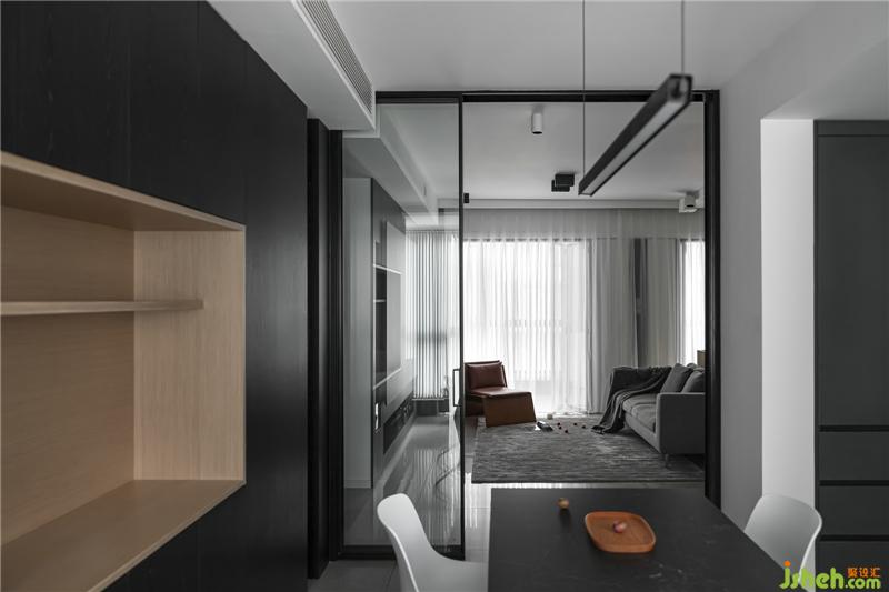 玻璃門劃分廚餐廳和客廳的空間,透露質(zhì)感,也解決了油煙的困擾。