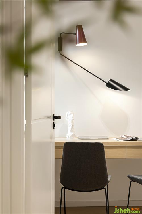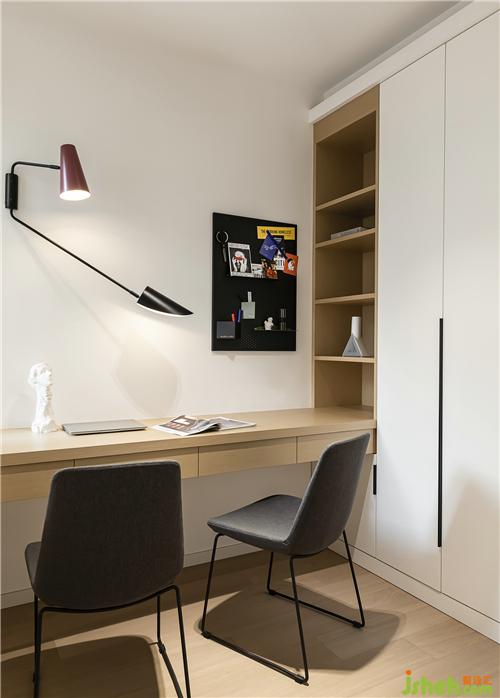 書房的懸掛式書桌,與柜體自然銜接,形成一體南京裝修設(shè)計。