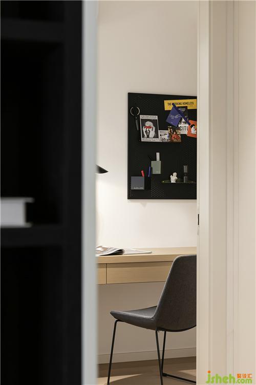 The hanging desk in the study is naturally connected with the cabinet to form a whole.