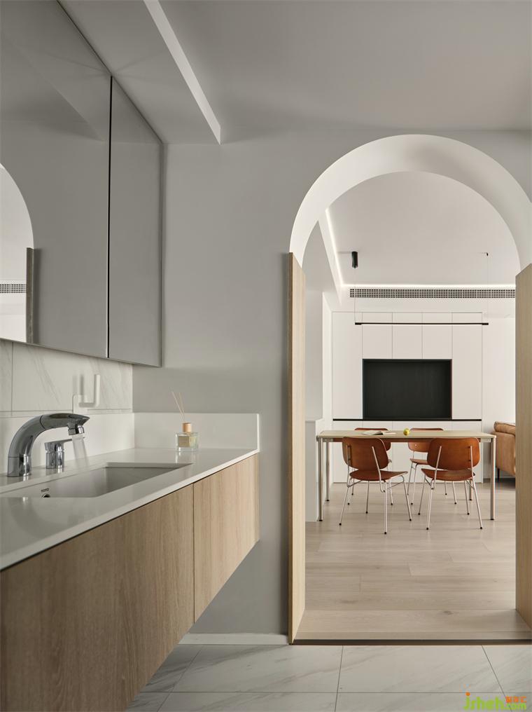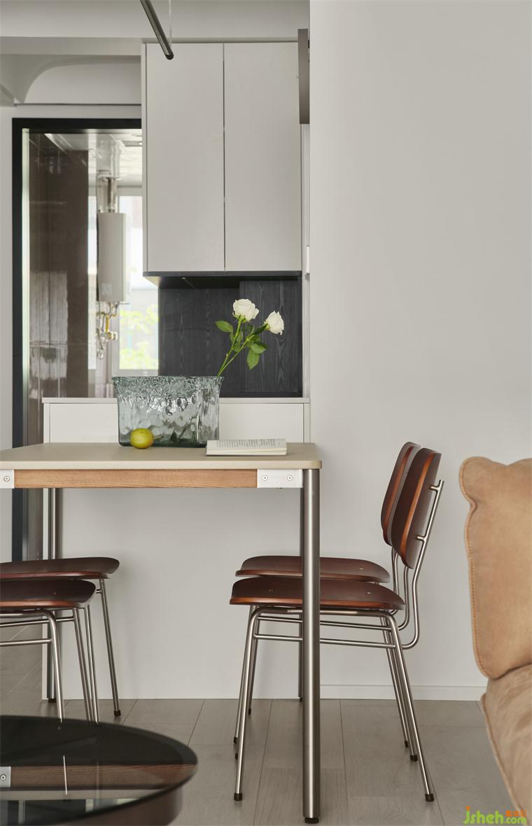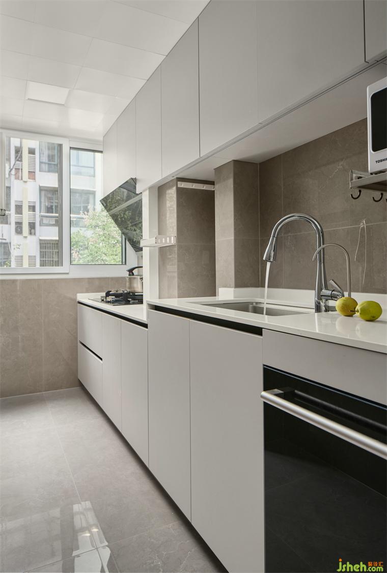 廚房臺(tái)面根據(jù)業(yè)主身高做了高低落差,廚房由擇菜、洗菜、切菜、炒菜、承盤這幾部分組成,室內(nèi)設(shè)計(jì)師不同的功能從舒適角度上看對(duì)于高度的需求不同