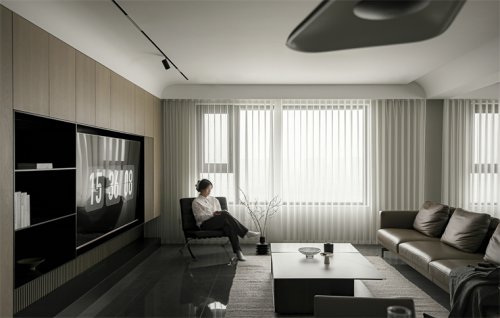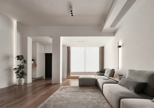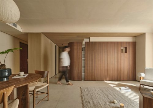 主臥看向客餐廳視角,藕粉、原木色、茉莉黃等暖色系組合,裝修公司散發(fā)出自然的溫馨感。