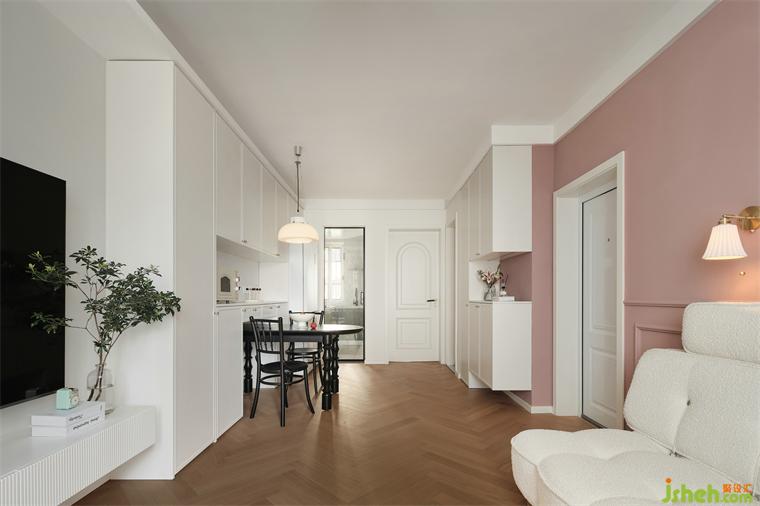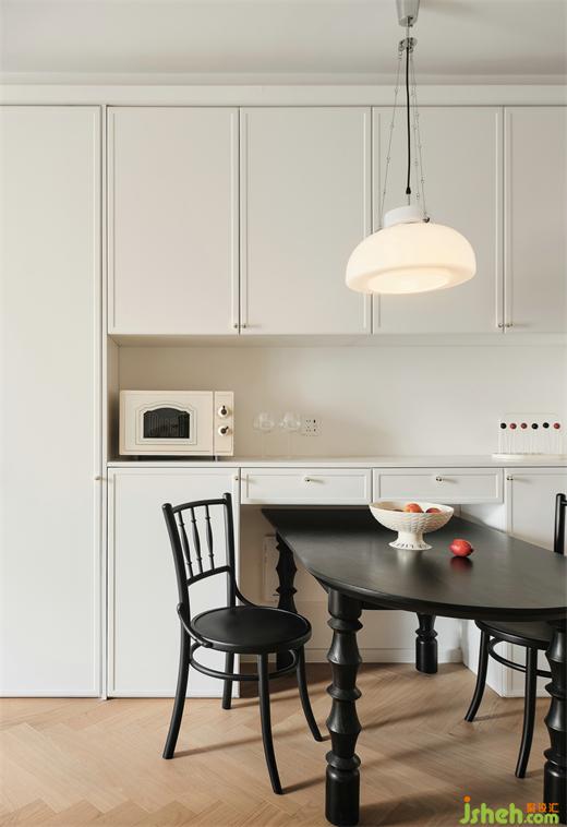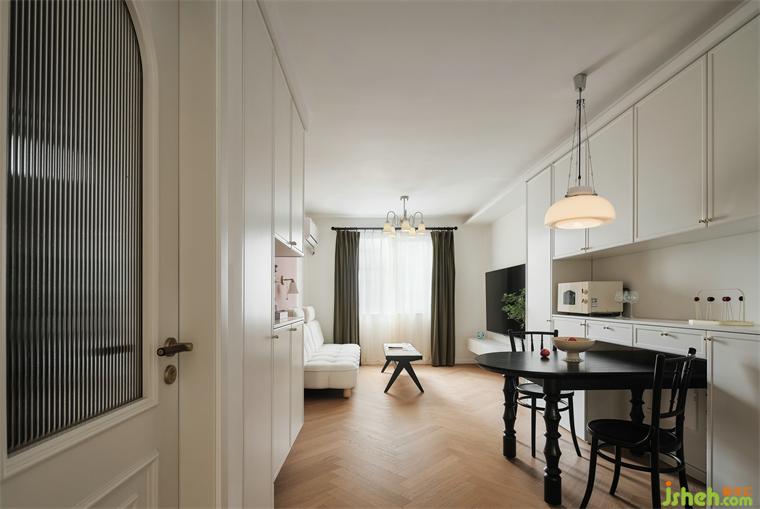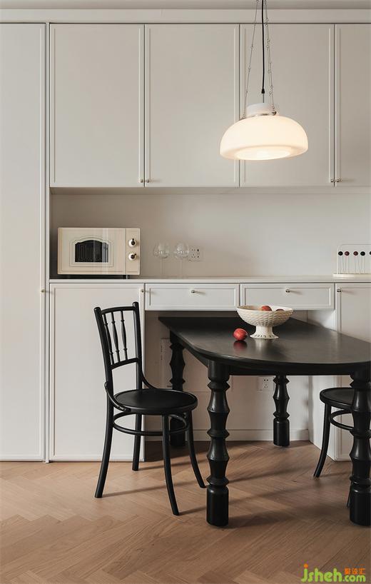 餐廳采用柜體收納式,餐桌嵌入式,增加收納又可以滿足三五好友來聚餐,秒變大長桌的實(shí)用性。