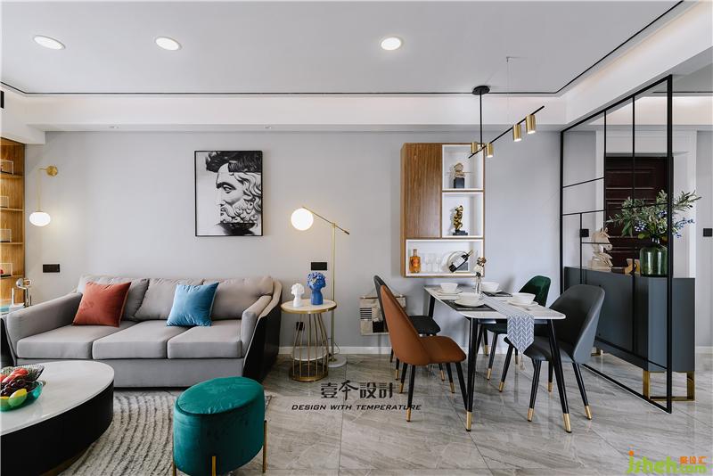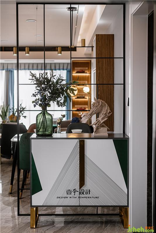 ▲玄關(guān)處一面黑色不銹鋼隔斷很好的分割了入戶玄關(guān)與客餐廳兩個區(qū)域。一款拼色的玄關(guān)柜撐起了整個空間的格調(diào),時尚簡約的造型,黑色烤漆的臺面,金色的柜腿設(shè)計,將形式上的意與美結(jié)合,時尚又不缺乏質(zhì)感。柜子上隨意擺放的馬頭,打破了空間的沉悶感,在燈光的映襯下呈現(xiàn)出完美的視覺效果。室內(nèi)設(shè)計師