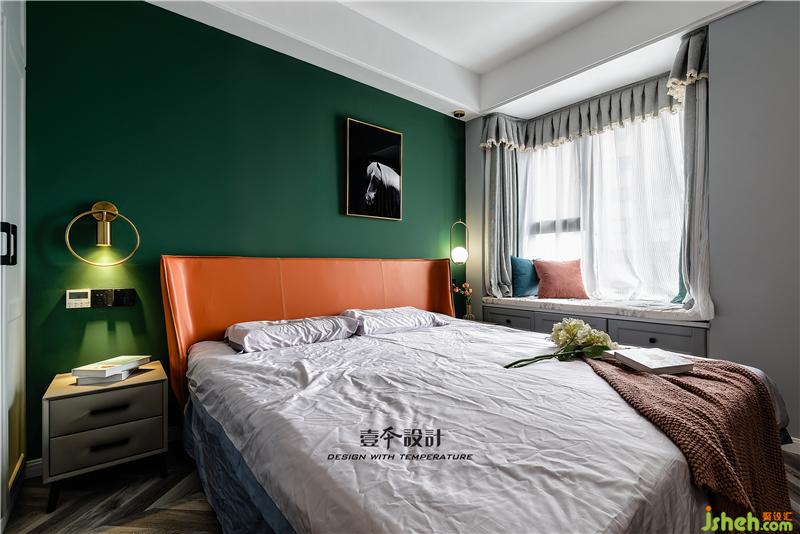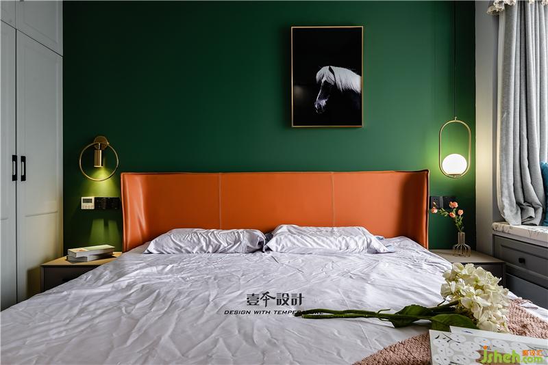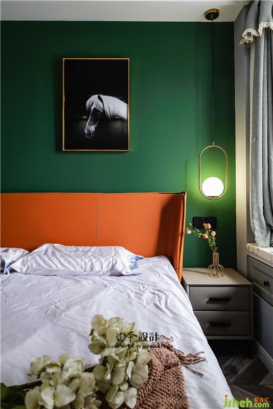 ▲主臥室床頭背景的墨綠色,最近年來很受歡迎的一種顏色,墨綠色墻面搭配意式輕奢橙色,也比純粹的綠色更加時(shí)尚。橙色的暖,墨綠的冷,恰恰平衡了整個(gè)空間。金色的壁燈又增加了空間的質(zhì)感,讓空間既時(shí)尚又溫馨,這是設(shè)計(jì)者的巧思,更是使用者的品味。