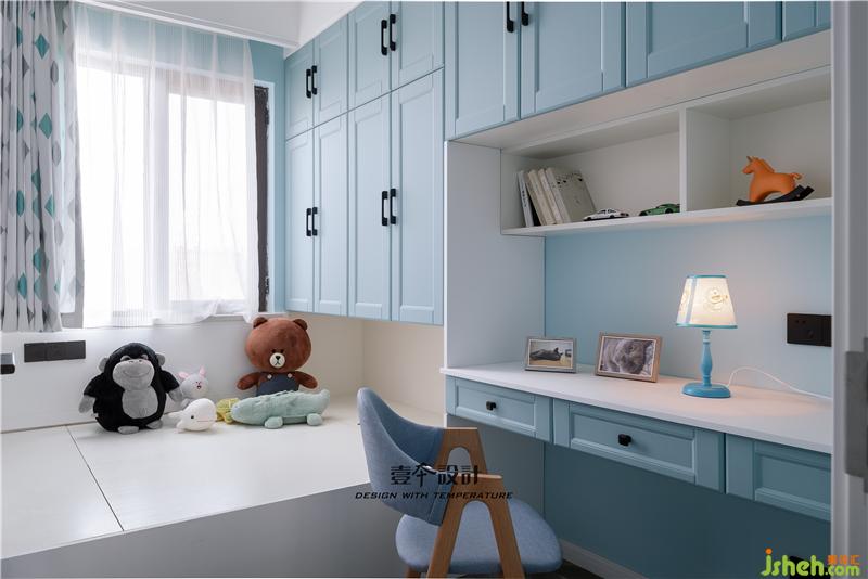 ▲寧?kù)o氣質(zhì)的藍(lán)色作為背景色,放置在榻榻米上的毛絨玩具是吸引孩子的關(guān)鍵??ㄍ艟?、可愛(ài)的貓咪擺臺(tái)映襯著孩子們單純可愛(ài)的內(nèi)心天地,再加上拼花色的窗簾更能激發(fā)孩子對(duì)外面世界探索的樂(lè)趣。