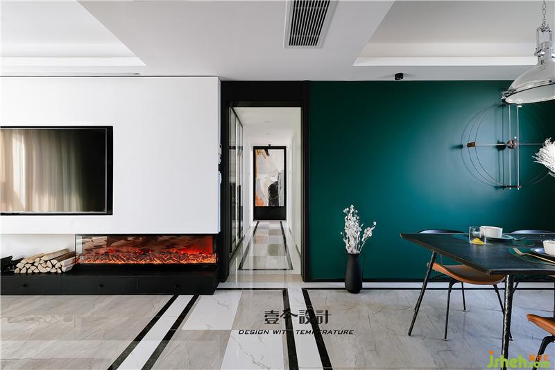 電視背景墻和餐廳背景墻一面整墻太過單一,我們設(shè)計了石膏板造型電視背景墻,下面嵌入壁爐增加了空間的靈動性。餐廳則滿刷MF綠色乳膠漆,采用黑色顯紋埡口門套做分隔,將客廳,過道,餐廳空間做了明顯的分區(qū)。