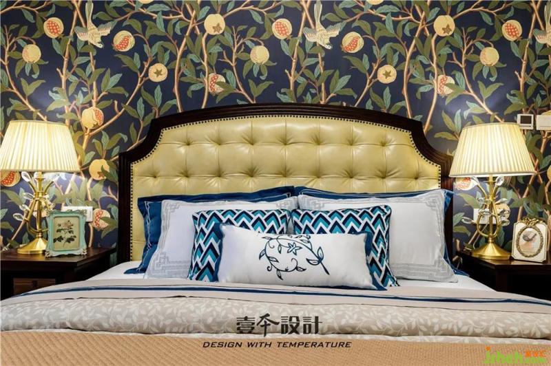 主臥床頭背景墻的墻紙是石榴花紋的圖案,花的枝蔓攀沿到臥室。自然、懷舊,仿佛散發(fā)著幸福的味道,營造溫情與浪漫的氛圍,