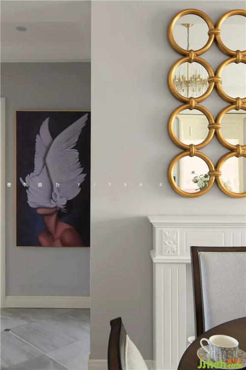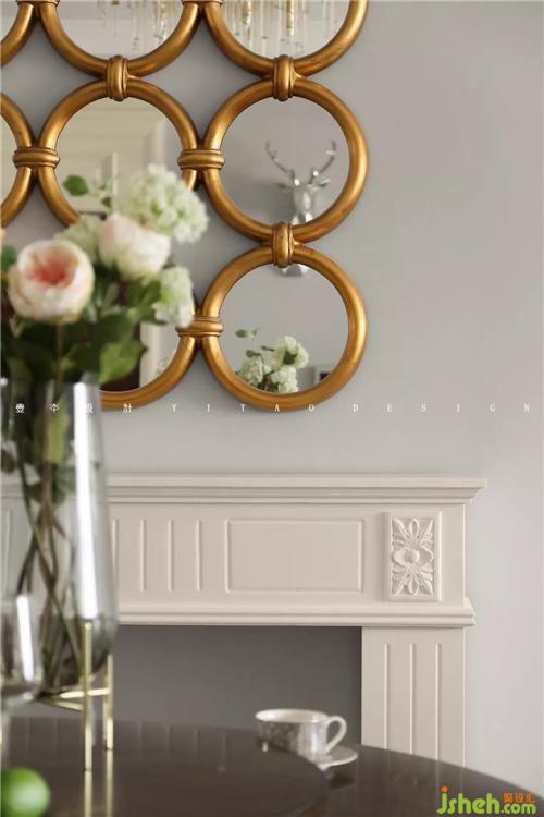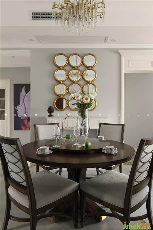 餐廳的金色圓鏡是點(diǎn)睛之筆,裝飾感極強(qiáng),鏡面的反射讓空間看起來更加有層次更加立體。室內(nèi)設(shè)計(jì)師