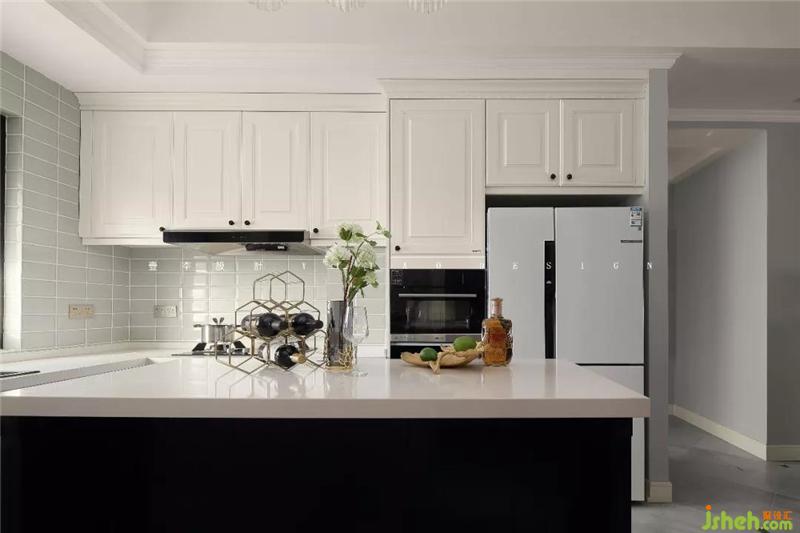 吧臺(tái)增加了廚房的使用效率,除了做備餐臺(tái)還可以作為早餐桌,吧臺(tái)采用用黑色烤漆板制作和廚柜的白色形成鮮明的對(duì)比。室內(nèi)設(shè)計(jì)師