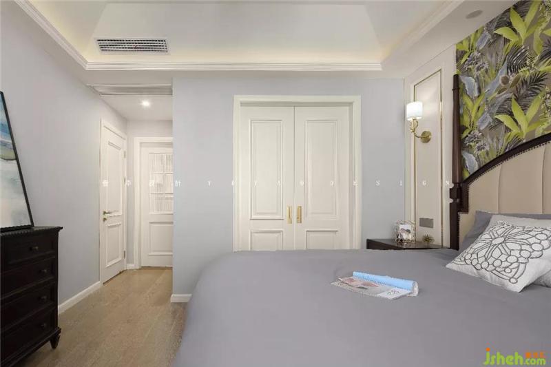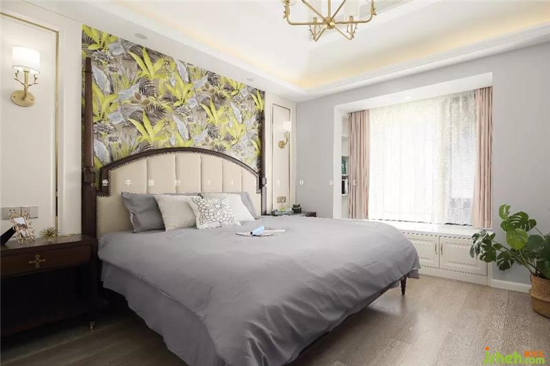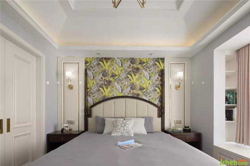 主臥延續(xù)客餐廳的配色風(fēng)格,背景墻草綠色的壁紙讓空間變得生機(jī)盎然。