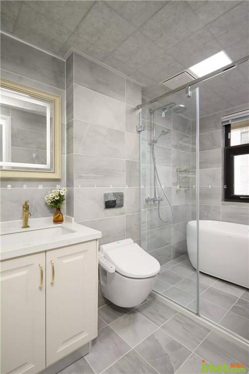 衛(wèi)生間仍然采用灰色的瓷磚,干凈清爽易打理,點綴金色的龍頭、拉手提升品質(zhì)感。
