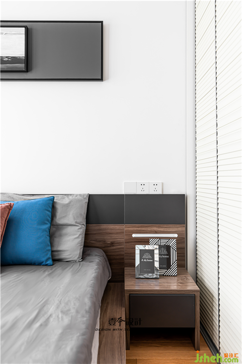 次臥的配色依然是木色、灰色和藍(lán)色的三色搭配。由于床頭背后墻一半是實(shí)體墻面一半是落地窗戶,所以選用床頭柜一體靠背的雙人床,起到遮擋背光和增加私密性的作用。一副疊加裝飾畫跨越實(shí)體墻和落地窗簾,將床頭背景連成一個(gè)整體。