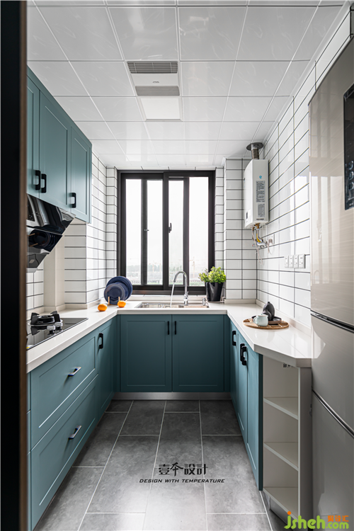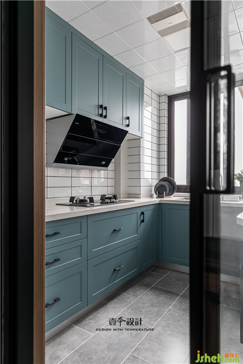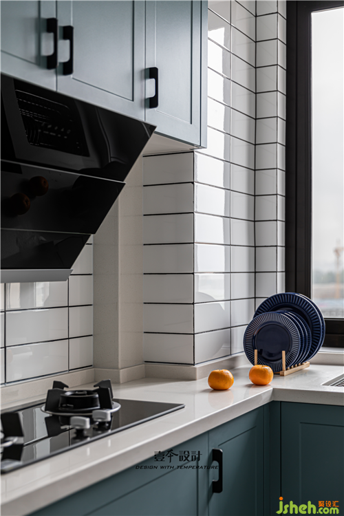 廚房墻面的小白磚,搭配灰藍(lán)色廚柜,干凈整潔不出跳,簡約又不失質(zhì)感,延續(xù)著整體設(shè)計(jì)風(fēng)格。