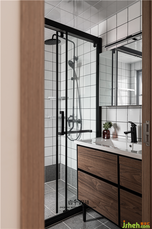 衛(wèi)生間采用格子小白磚和灰色水磨石鋪貼,搭配木紋色的浴室柜,MUJI風(fēng)的既視感,質(zhì)樸而簡約。