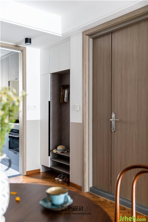 入戶玄關(guān)簡(jiǎn)單實(shí)用,室內(nèi)設(shè)計(jì)師設(shè)置了換鞋凳,鞋柜底部留空,放常穿的鞋子,換鞋、掛上外套、取下帽子,輕松完成所有換裝動(dòng)作。