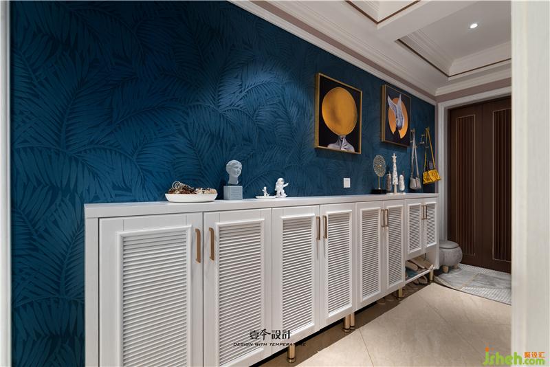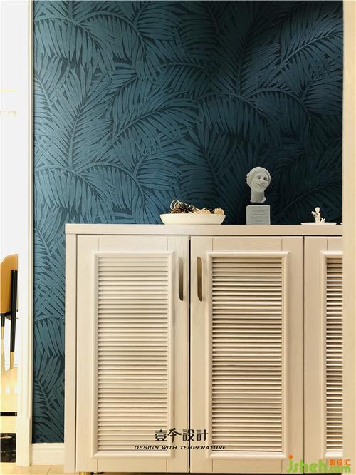 進門右手墻面比較長,為降低視覺上的沖擊力,室內設計師做了一組鞋柜,進門將包包等物品掛在金屬掛鉤上,坐在換鞋凳把鞋換下,底部懸空便于收納常用拖鞋,百葉門鞋柜搭配金屬把手,簡潔大方。