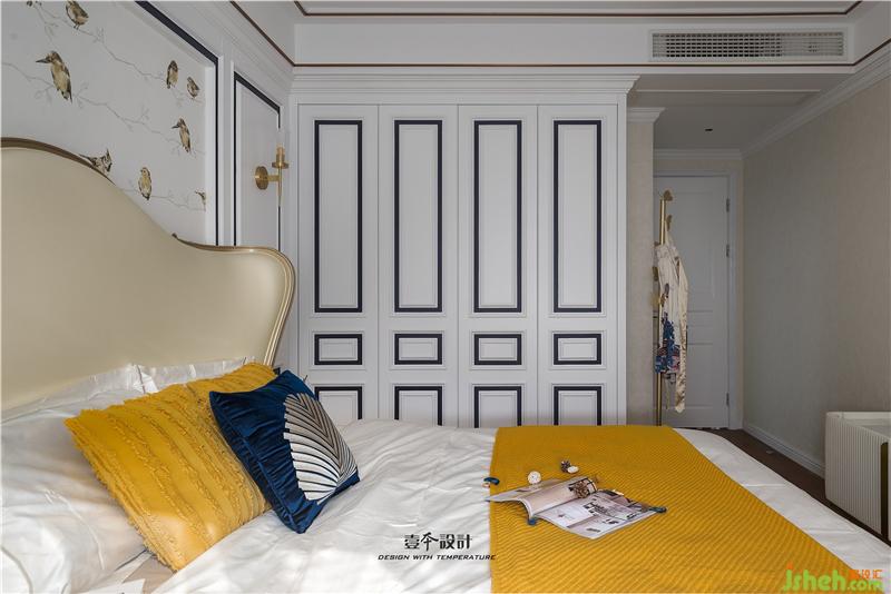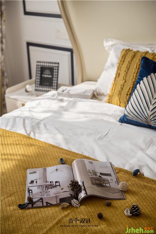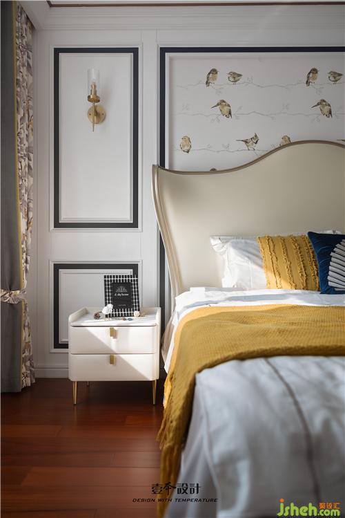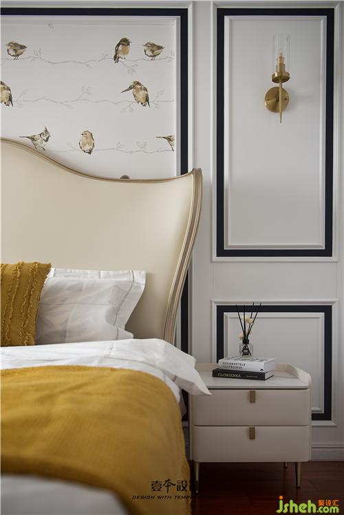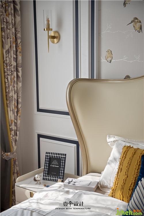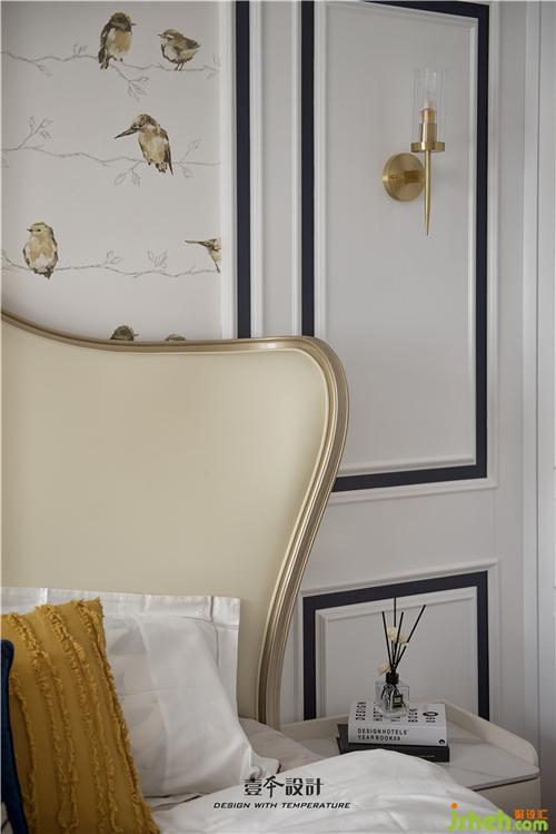 臥室延續(xù)客廳風(fēng)格,室內(nèi)設(shè)計(jì)師在頂面加了金屬線條,米色的皮藝床,精致的壁燈,整體搭配也讓臥室顯得干凈優(yōu)雅。
