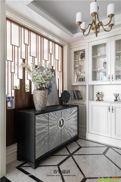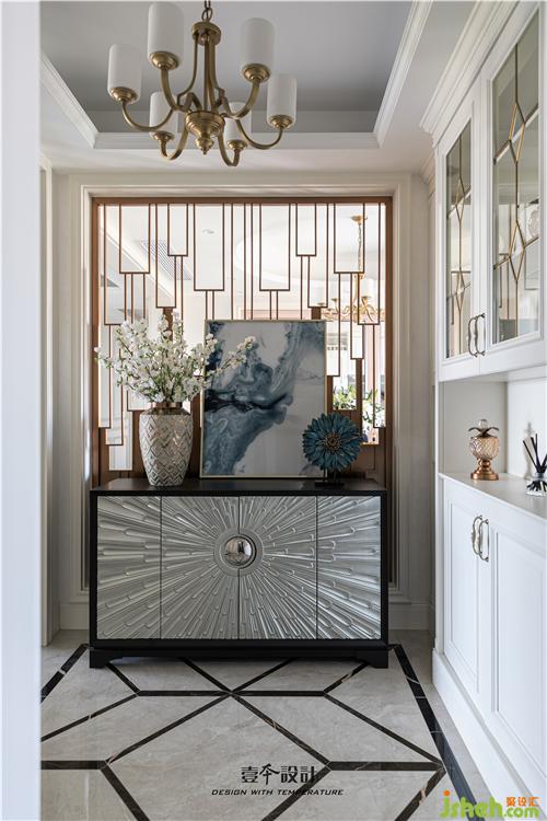 推開門,一個優(yōu)雅大氣的入戶玄關(guān)區(qū)呈現(xiàn)在我們眼前,迎面是一組輕奢質(zhì)感的金屬元素玄關(guān)柜和裝飾畫,讓人眼前一亮的同時也增加了收納空間。原來厚重的墻體拆掉室內(nèi)設(shè)計師設(shè)計成通透的金屬隔斷,引入光線、增加空間之間的連通,達(dá)到移步易景的效果。進(jìn)門右邊的整墻鞋柜,特意設(shè)計成深淺疊進(jìn)的造型,即解決了門邊墻體尺寸不夠鞋柜厚度的問題,也讓整墻鞋柜不顯得死板。