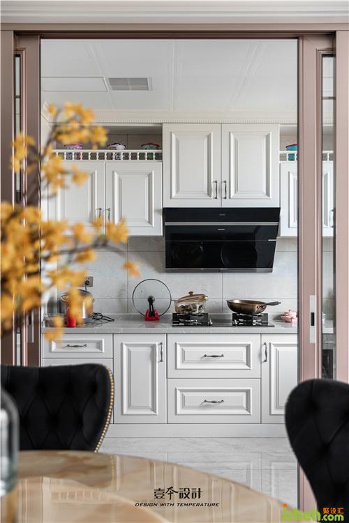 廚房白色的櫥柜,搭配復(fù)古銅色拉手,廚房和餐廳用推拉式玻璃門進(jìn)行隔斷,室內(nèi)設(shè)計師選用玫瑰金色的移門邊框,延續(xù)輕奢的質(zhì)感,整個廚房優(yōu)雅又精致。