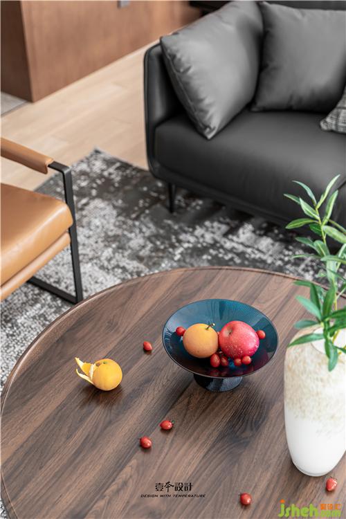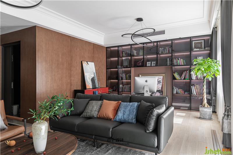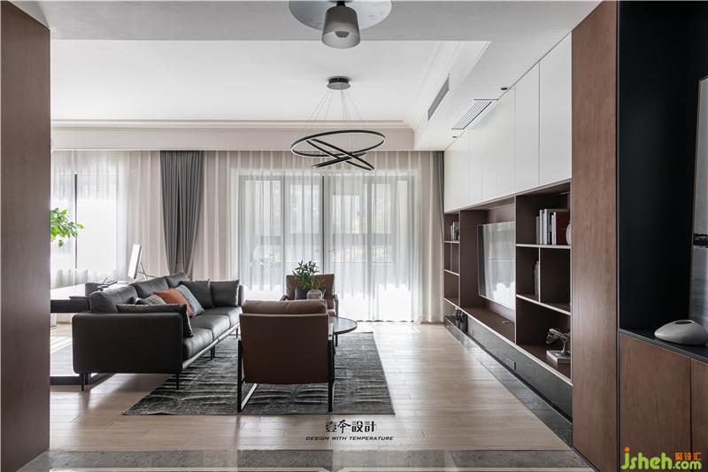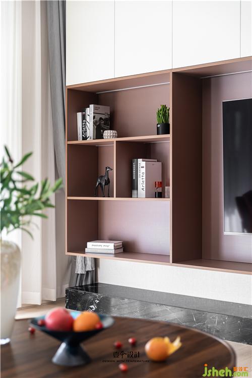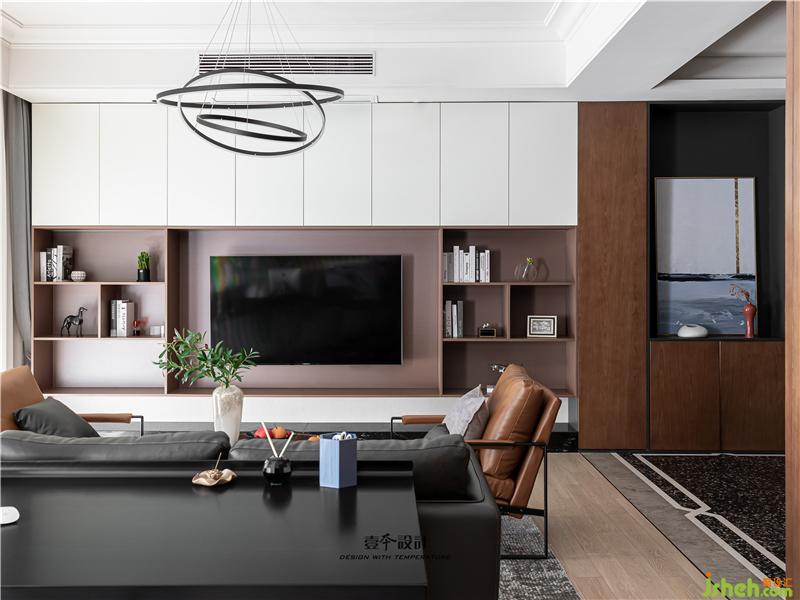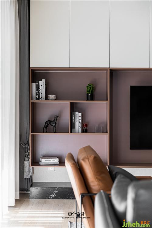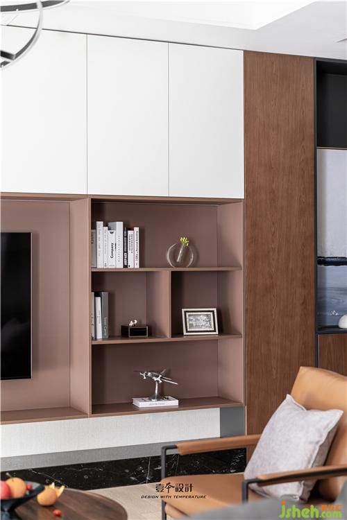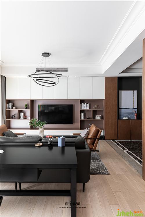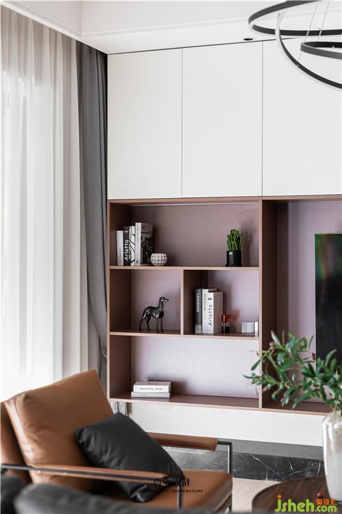 客廳電視背景墻設計了滿墻電視柜,黑白根大理石的加入提升品質,在黑白的底色中加入琥珀色的電視柜,空間更加溫潤。懸空開放格與實門柜體的組合,虛實之間營造簡約的臺式氛圍。