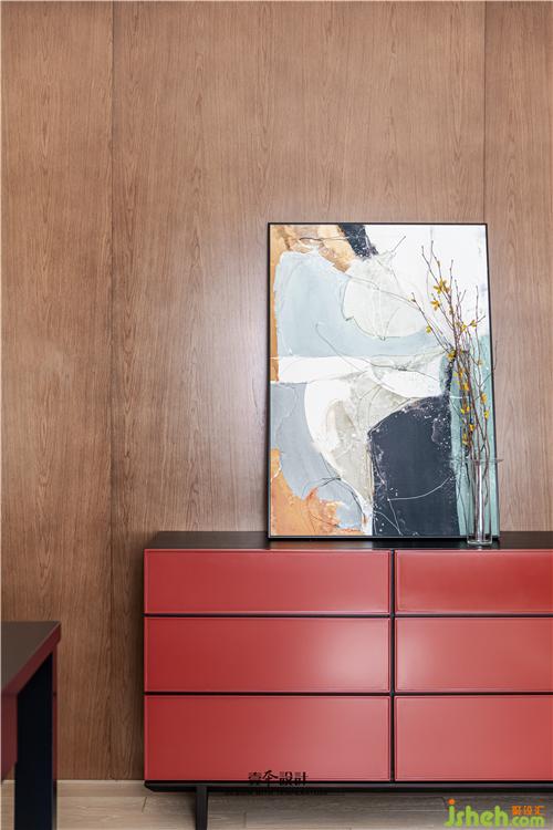 將衣柜與梳妝臺合二為一,二者通過大板連接起來,自然而流暢的將女主梳妝臺與日常的隨手掛放,儲物區(qū)域融為整體。