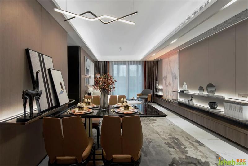 客餐廳作為家庭生活主要互動空間,立面處理整體連貫,將玄關(guān)鞋柜、餐桌、沙發(fā)位三個功能空間整體融合在一個空間氛圍之下,以筆挺、堅(jiān)毅的風(fēng)格體現(xiàn)家庭審美格調(diào)與精神。