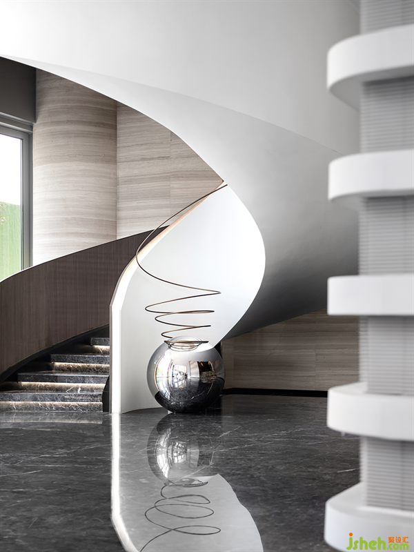 作為樓梯形式中最生動和雕塑感的存在,旋梯引領(lǐng)人全角度看遍風景。武漢售樓處設(shè)計空間中嵌入白絲帶般的旋梯,如天鵝之頸優(yōu)雅至極。球形雕塑恰到好處,標定旋梯的軸心,一條金色的螺線盤旋向上,引領(lǐng)人們的視線望上二層。