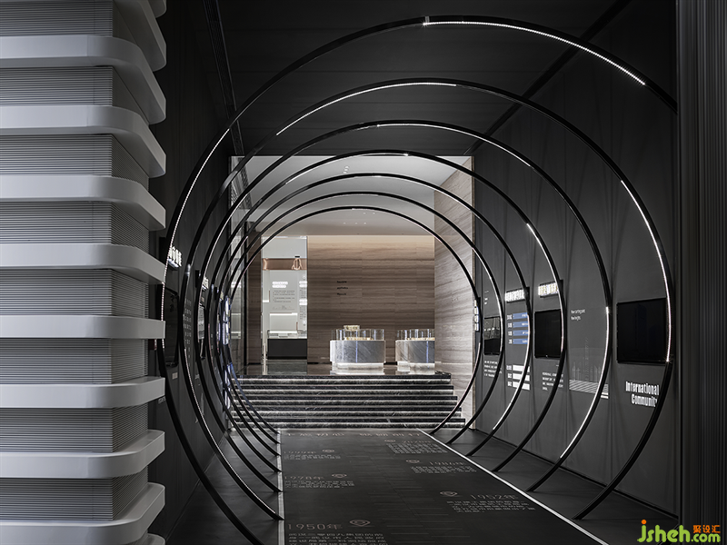 一條時間隧道,連接了兩個空間,科技感十足的LED燈帶,將方體空間重塑,一環(huán)一環(huán)加載了穿梭體驗。深色背景退后,將注意力投入在屏幕上輪播的影片上,解析產(chǎn)品的精髓。