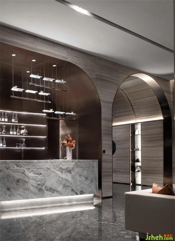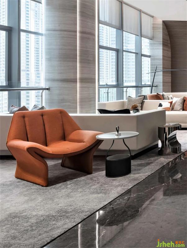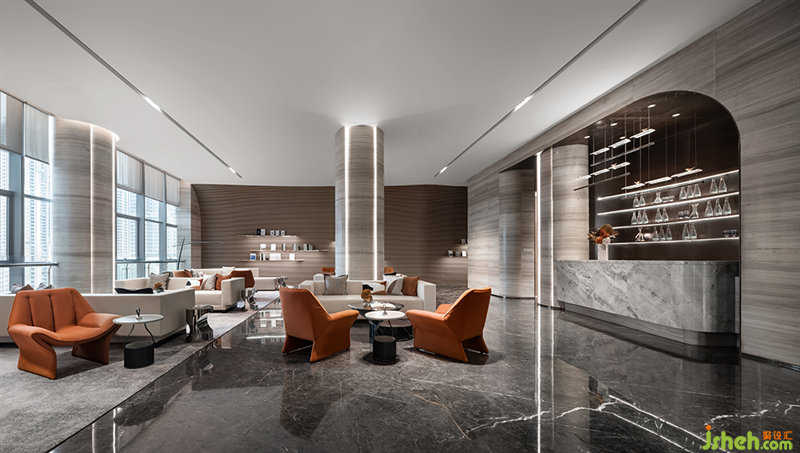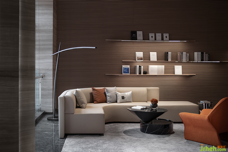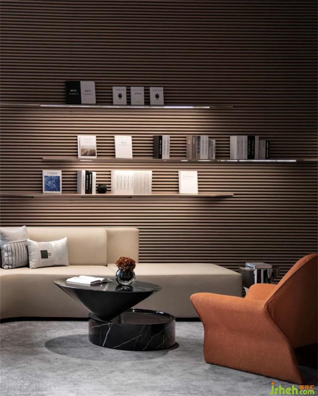 武漢售樓處設(shè)計從山形墻面的階梯式書吧,延續(xù)到洽談區(qū),嵌入隱形結(jié)構(gòu)的層板,在墻面上形成自然書架。暖意的皮革沙發(fā),形成舒適且人文氣息濃厚的洽談場景。橙色的軟裝點綴在空間中,形成一個個跳躍靚麗的音符。