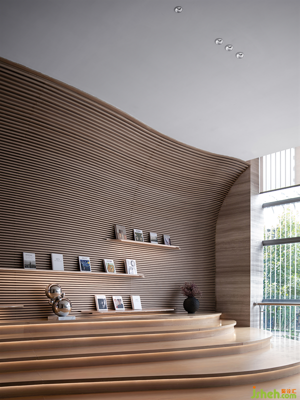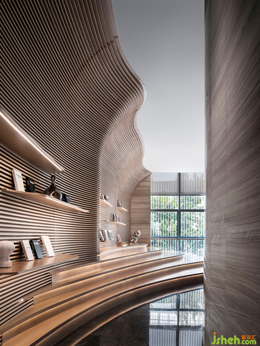 古雅悠長的節(jié)奏,具有一種身處山間,自然氣息撲面而來的氣質(zhì)。這種悠然的意象,在三層藝術(shù)廊中喚起一種內(nèi)心的向往。山水田園一體,首層透明的水波層疊意象,到了藝術(shù)廊就演變成層巒疊嶂的山間密語。