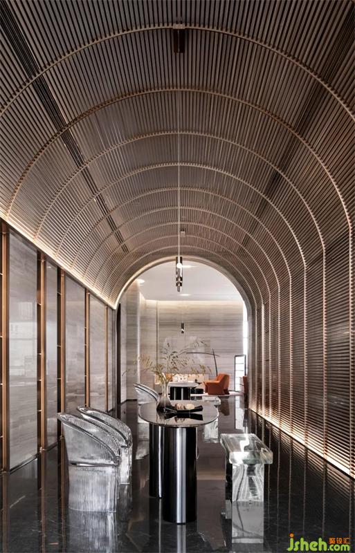 一間優(yōu)雅的茶室既是兩個洽談區(qū)之間的“文化走廊”,亦是多功能室,可滿足不同需求。拱面金屬格柵造型,弱化空間方與閉塞之感,以柔美的形態(tài)點亮空間。吉岡德仁的透明長凳純凈如冰,與鋼絲椅并置,透出一種空靈的美感。