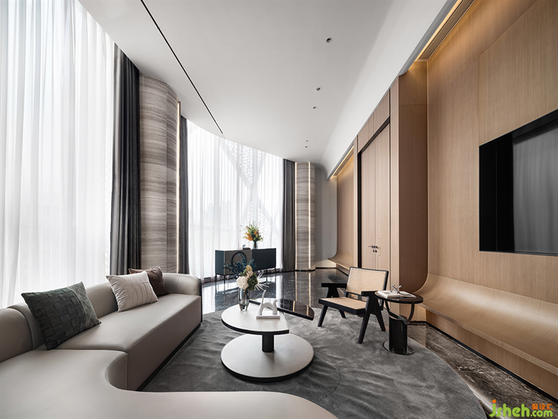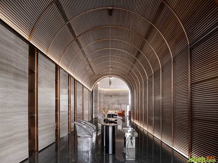 VIP是空間中的歸結(jié)點,也擁有最好的風景。半圓弧的空間以一種擁抱的姿態(tài)構(gòu)成空間主體,將核心聚攏在洽談區(qū)。木制墻板以完美幾何曲線,溫文爾雅地表達出對東方人的生活的態(tài)度,一如反復吟詠的楚辭,唱誦千年。