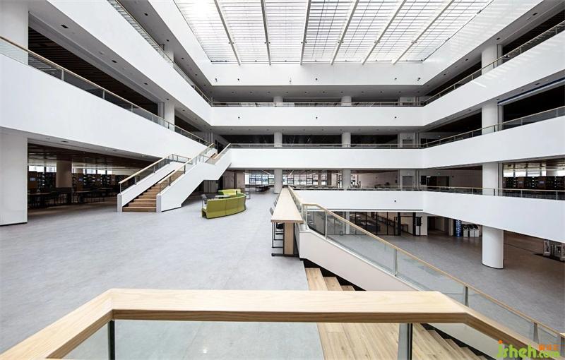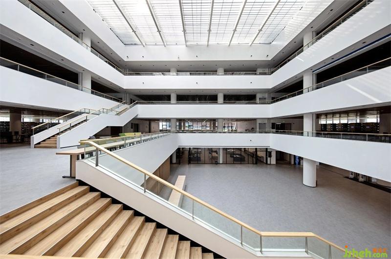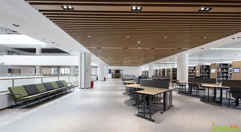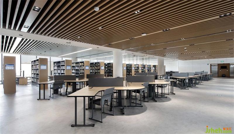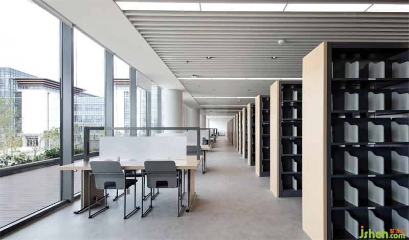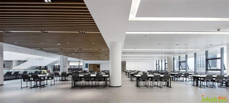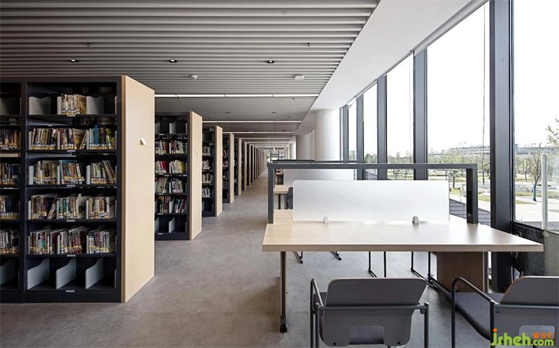 攜上一本書,在陽(yáng)光下走進(jìn)知識(shí)的殿堂。開(kāi)放式書架由亮光黑色墊層、啞光黑灰色鋼架制成,頂部采用白色的條形金屬掛片,整個(gè)空間呈現(xiàn)純凈、自然的氛圍。