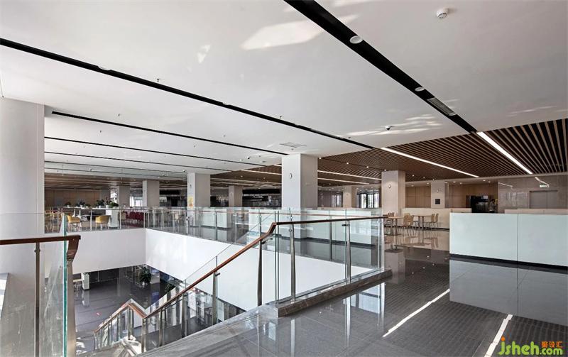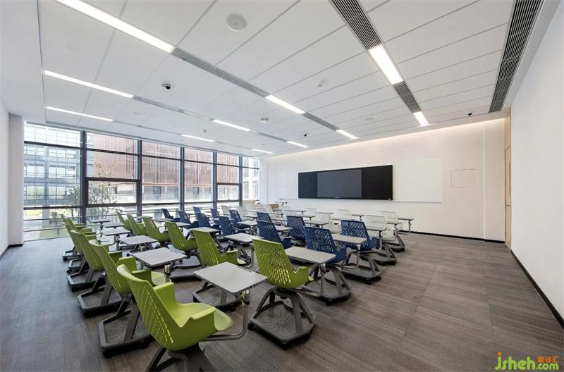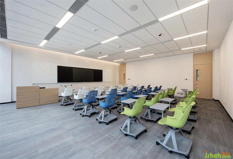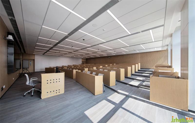 室內部分也同樣延續(xù)了外立面的線性設計風格,通過燈光的序列感與頂面的線條感,打造出嚴謹?shù)目臻g氛圍。教室頂面的燈光造型,采用錯置的燈光排列,更符合人在空間中的視覺感受。
