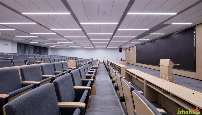 報告廳整體遵從環(huán)保、綠色觀念,學院設計采用木色為主色調,配以座椅的藍色進行空間色彩調和,創(chuàng)造一個愉快、舒適的環(huán)境。
