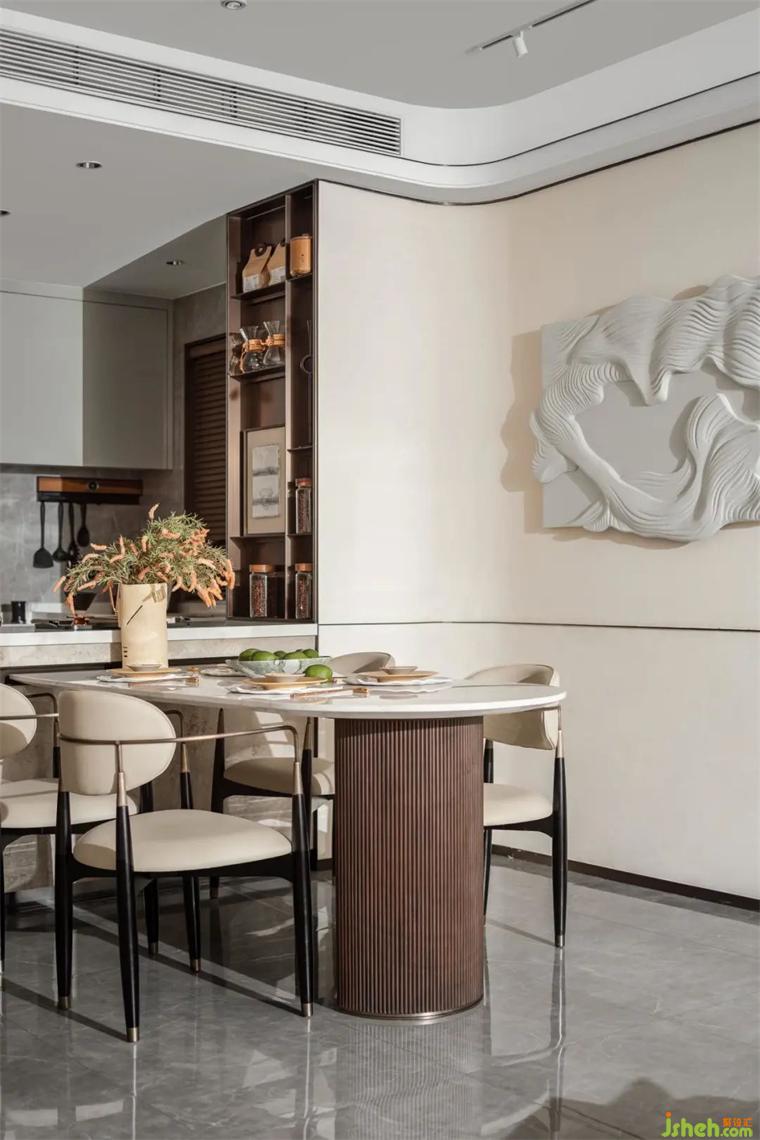設(shè)計師弱化了很多常規(guī)的輪廓,對空間、光線和線條的處理游刃有余,在餐廳的設(shè)計上正是如此。運(yùn)用曲線或弧形,讓整體空間看起來更圓潤流暢,利落的線條,清晰的空間構(gòu)造,步調(diào)和諧統(tǒng)一讓餐廳與客廳巧妙地融合在一起。