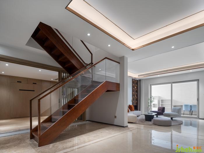 北京復(fù)式大宅設(shè)計(jì)將原本封閉式的樓梯改造成開放式樓梯,連接舞蹈室、休閑區(qū),讓整個(gè)空間更為通透,極大提升空間感。